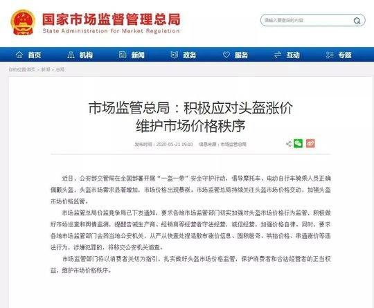 河南省开封市市场监督管理局也发布提醒告诫书,要求经营者和企业规范市场行为,各级市场监管部门将加大对头盔价格监管力度,保持12315消费者维权举报热线畅通,及时受理群众价格投诉举报,依法查处各类价格违法行为等。对查实存在哄抬价格、捏造散布涨价信息、相互串通等价格违法行为的,依法最高处违法所得的5倍罚款;没有违法所得的,处5万元以上50万元以下的罚款;情节严重的,责令停业整顿或者吊销营业执照;对典型案件,将公开曝光;严重扰乱市场秩序,构成犯罪的,移交公安机关依法追究刑事责任。