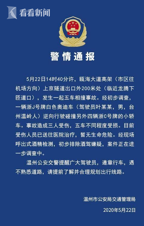 之后,@温州交警发布消息,5月22日下午,瓯海大道高架发生一起五车相撞事故,一辆浙J号牌白色奥迪车逆向行驶碰撞另外四辆浙C号牌小轿车,造成三人受伤,暂无生命危险;五车不同程度受损。经现场呼出式酒精检测,初步排除酒驾嫌疑,案件正在进一步调查中。