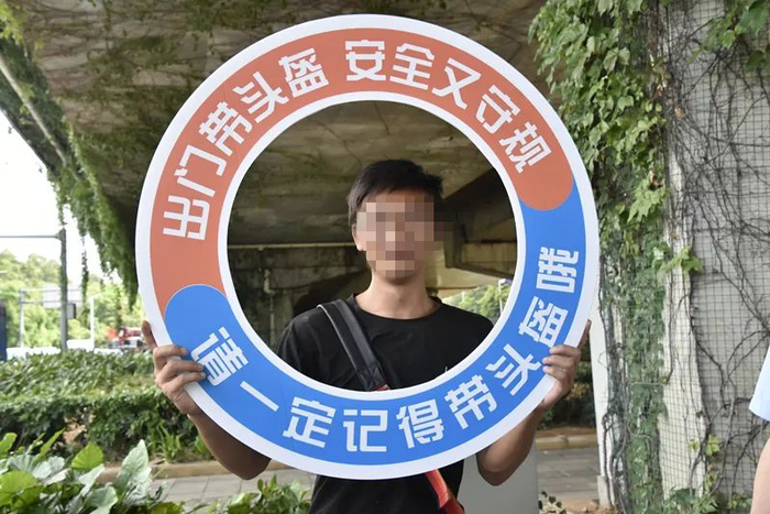 交警要求该男子举起提醒牌合影