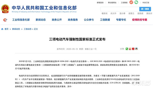 前不久,5月18日,《电动汽车安全要求》《电动客车安全要求》《电动汽车用动力蓄电池安全要求》等三项强制性国家标准获得批准发布。