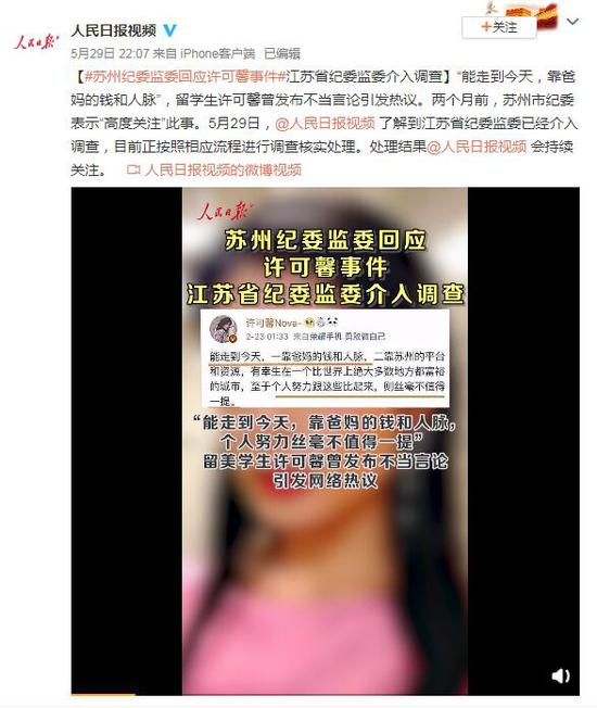 “能走到今天,靠爸妈的钱和人脉”,留学生许可馨曾发布不当言论引发热议。两个月前,苏州市纪委表示“高度关注”此事。5月29日,@人民日报视频 了解到江苏省纪委监委已经介入调查,目前正按照相应流程进行调查核实处理。处理结果@人民日报视频 会持续关注。