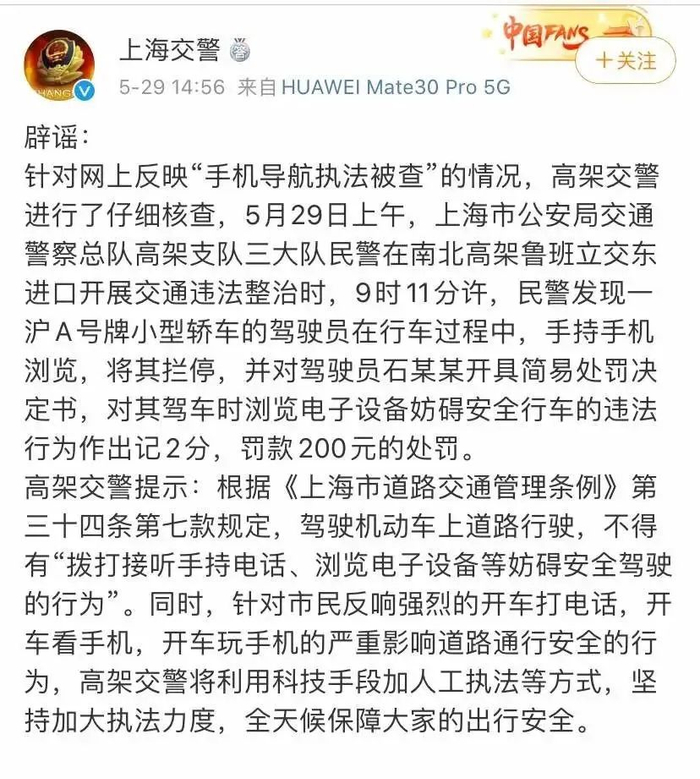 而后,上海市交警部门通过微博回应称,针对网上反映“手机导航执法被查”的情况进行了仔细核查,5月29日上午,上海市公安局交通警察总队高架支队三大队民警在南北高架鲁班立交东进口开展交通违法整治时,发现一沪A号牌小型轿车的驾驶员在行车过程中,手持手机浏览,将其拦停,并对驾驶员石某某开具简易处罚决定书,对其驾车时浏览电子设备妨碍安全行车的违法行为作出记2分,罚款200元的处罚。