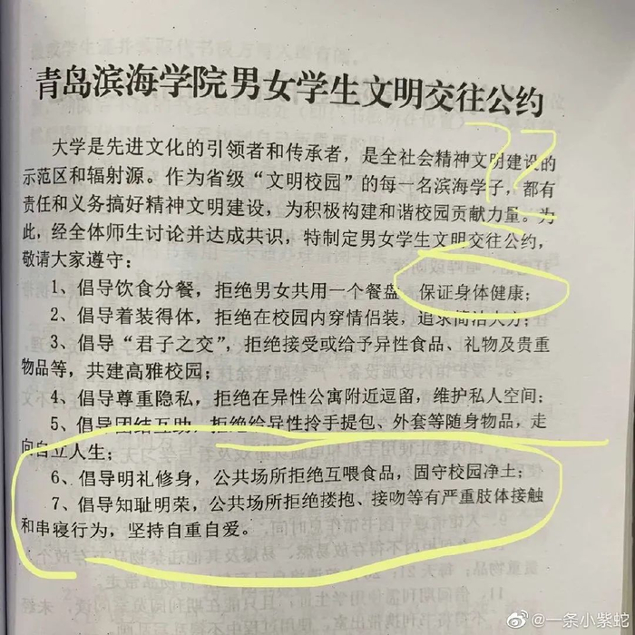 早在2016年,山东青岛滨海学院就被媒体曝出“不鼓励学生谈恋爱,更不允许男女生之间有过激行为”,时隔四年,该校依旧坚持着这些“交往准则”。