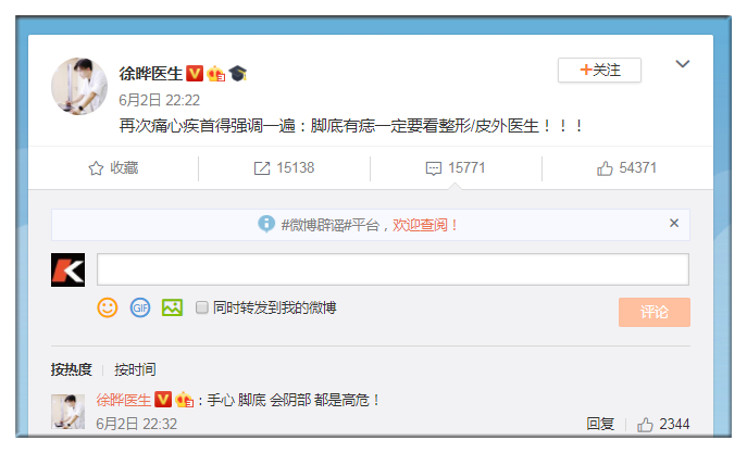 一夜之间,全国网友的动作整齐划一——扳自己的脚底板,看有没有一颗痣,只因一条名医的微博。