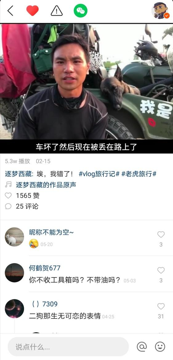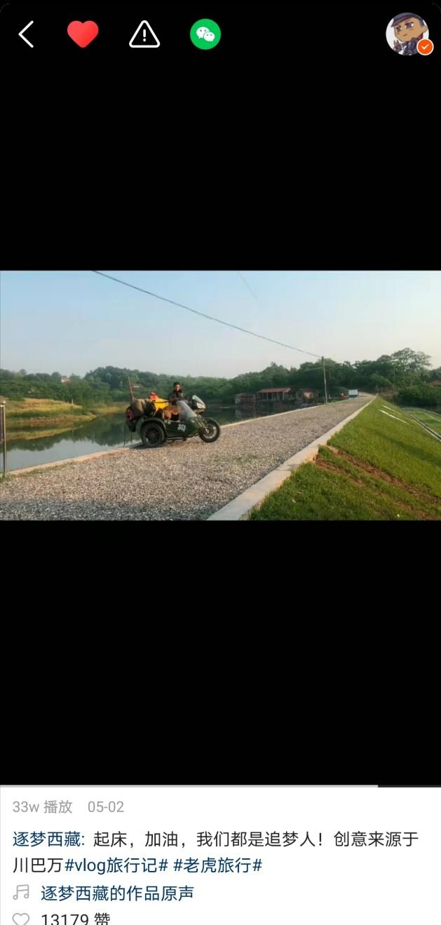 一位“朋友”,一辆嘉陵600摩托车,一切都在路上。雷家虎的快手账号“逐梦西藏”(快手ID:213017548)如今已有29.8W粉丝,同步记录了旅行中的见闻和趣事。