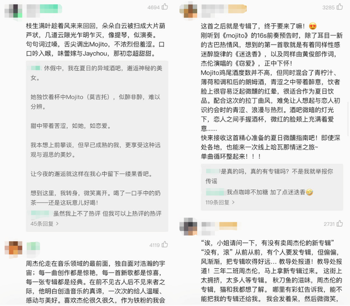 “在《说好不哭》上线时,我也守在手机前,结果守新歌的人太多,连QQ音乐都被挤宕机了。所以今天我特意等到0点8分,才打开QQ音乐买了《Mojito》。”他没想到才8分钟,新歌评论数就已经爆表。“评论区有80后、90后甚至00后,感觉大家的回忆都聚到这里了,像一起渡过了一个温馨的节日。”