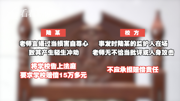 陆某究竟为何跳楼?陆某一方提出,他母亲到学校之后,王老师批评陆某上课不专心听讲、平时不求上进、只知道和女同学玩。因此,陆某一方认为,王老师言语过当, 损害了陆某的自尊心导致他产生跳楼轻生的冲动!学校负有相关责任。于是,将学校告上法庭,要求学校赔偿医药费、护理费、残疾赔偿金等15万多元。