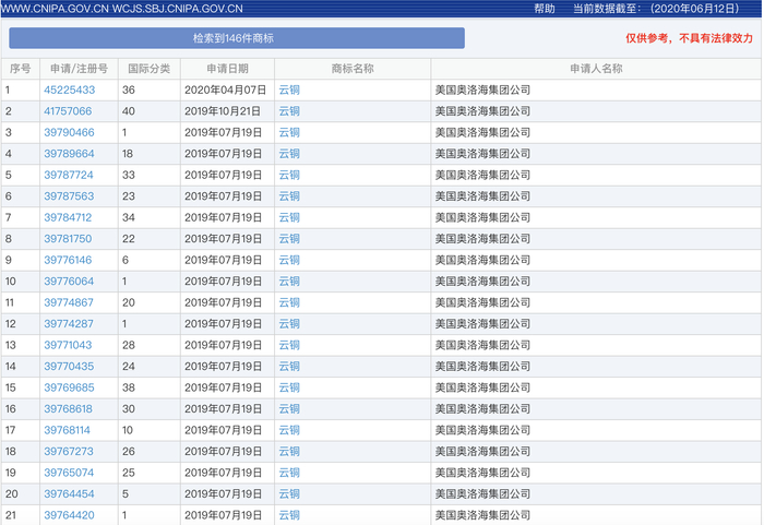 值得注意的是,尽管中国云铜和国内云南铜业等公司就“云铜”等商标展开十余年司法纠纷,然而,目前美国奥洛海这家公司在相关商标数量上却占据着绝对优势。