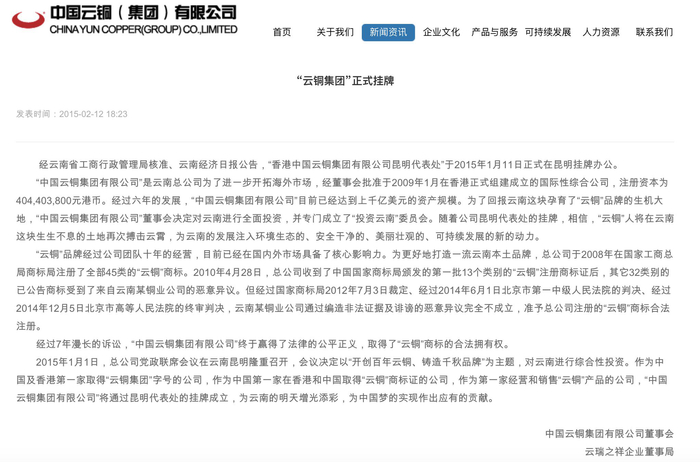 中国云铜官网还曾于2015年2月发布了香港中国云铜集团有限公司昆明代表处正式在昆明挂牌办公的消息,这则消息的落款为中国云铜集团有限公司董事会、云瑞之祥企业董事局。