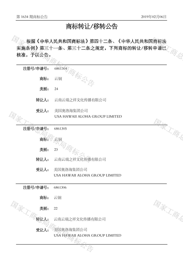 这家美国公司究竟是谁?此次收购消息引发外界质疑后,中国云铜在6月1日下午的申明公告中透露:中国云铜集团有限公司于2019年及2020年分别收购了美国奥洛海集团公司(USA HAWAII ALOHA GROUP LIMITED)持有的《云铜》商标真实、合法、有效,交易价格分别为2.34亿美元和43.7亿美元。