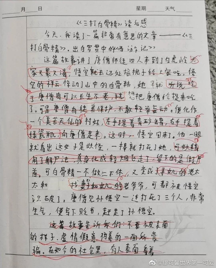 缪可馨的作文《三打白骨精》读后感,上面满是修改痕迹。图片/“缪可馨世界第一可爱”微博