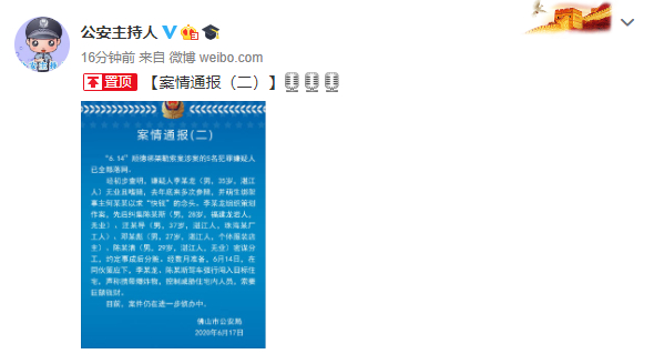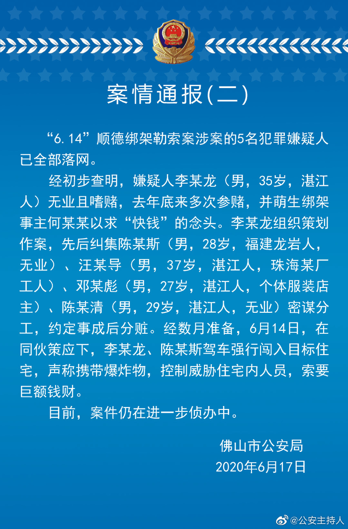 6月17日晚,佛山公安局网络发言人官方微博发布案情通报,“6·14”顺德绑架勒索案涉案5名犯罪嫌人已全部落网。
