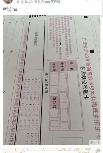 2020年的广东省普通高等学校本科插班生考试,因受疫情影响,推迟到6月13-14日进行。然而在6月13日下午,一则微博引起了广大考生们的注意,当中发布了一张艺术概论考试的空白答题卡。