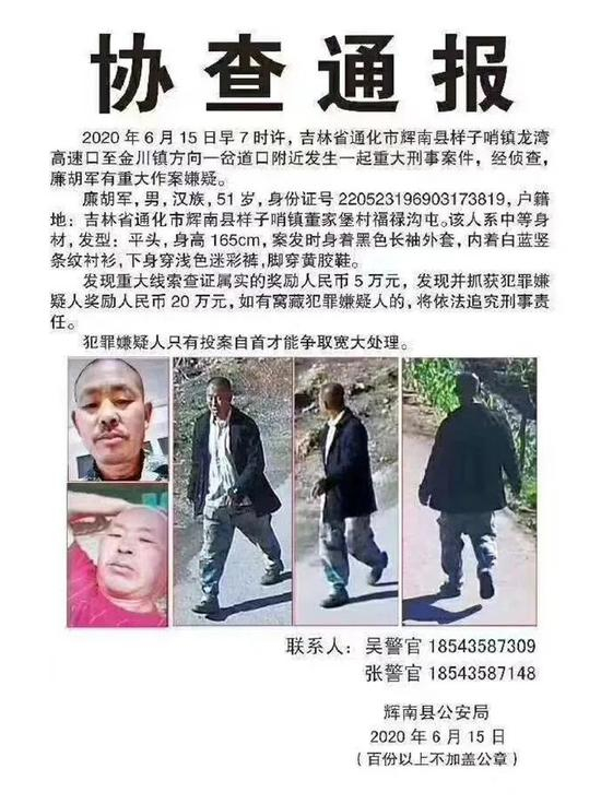 此前,辉南警方曾多次发布协查通报,至6月22日,吉林省辉南县警方再次发布协查通报,征集重大刑事案件嫌疑人廉胡军的线索,发现重大线索并查证属实的奖励5万元,发现并抓获的奖励20万元。