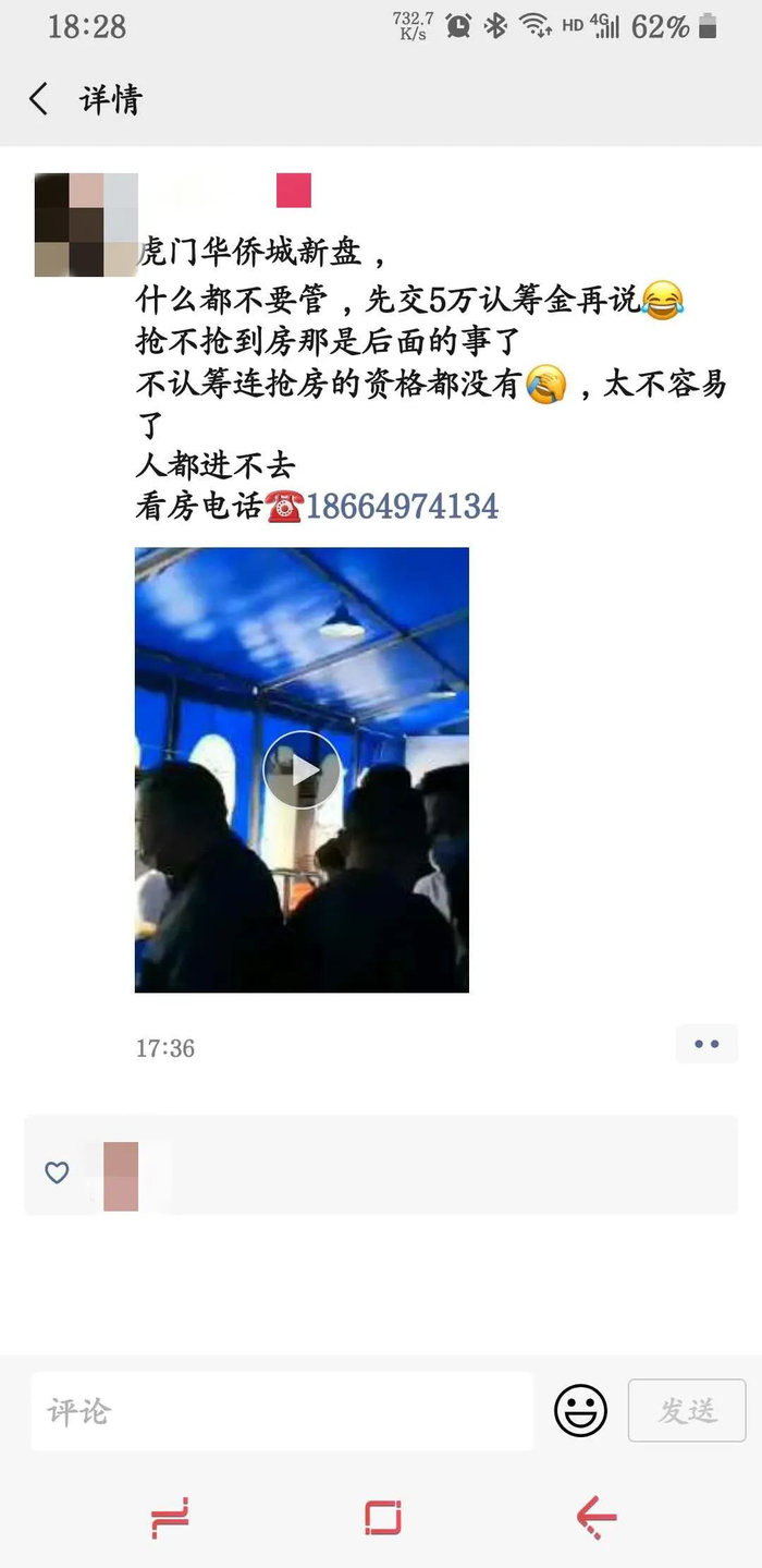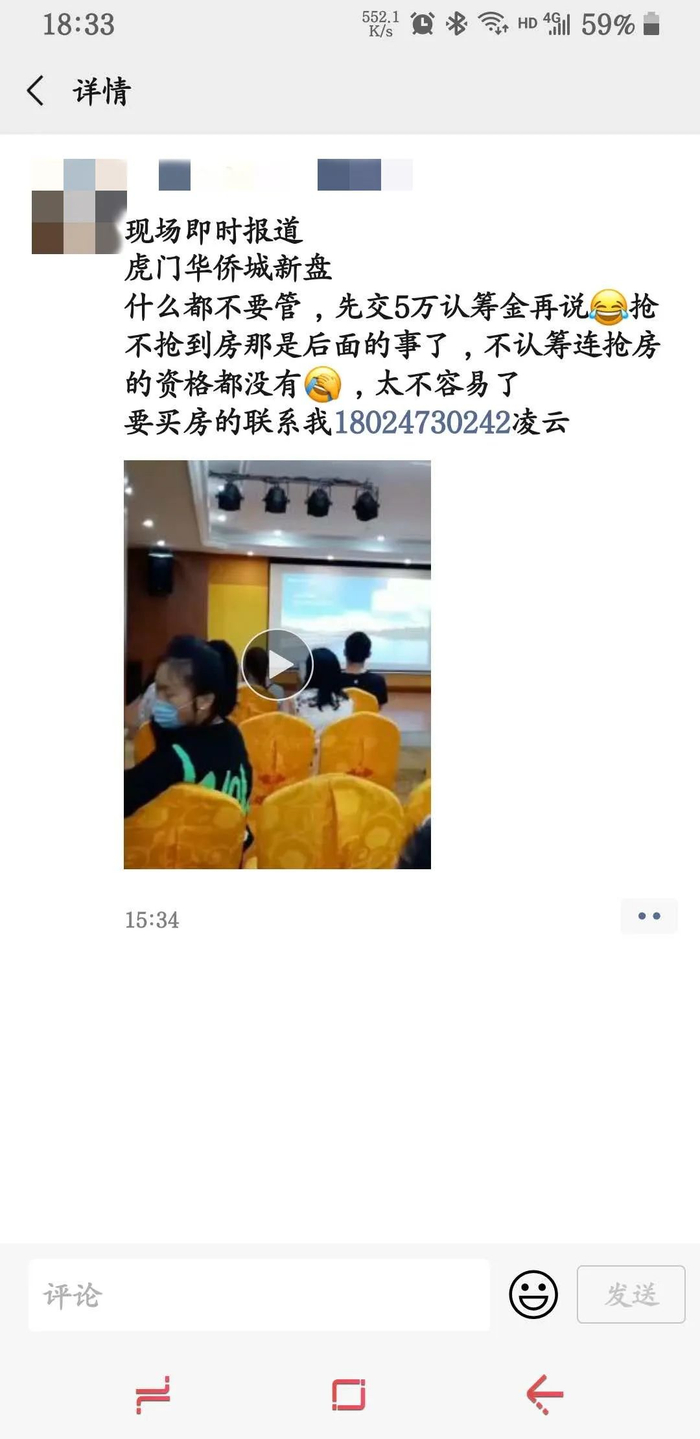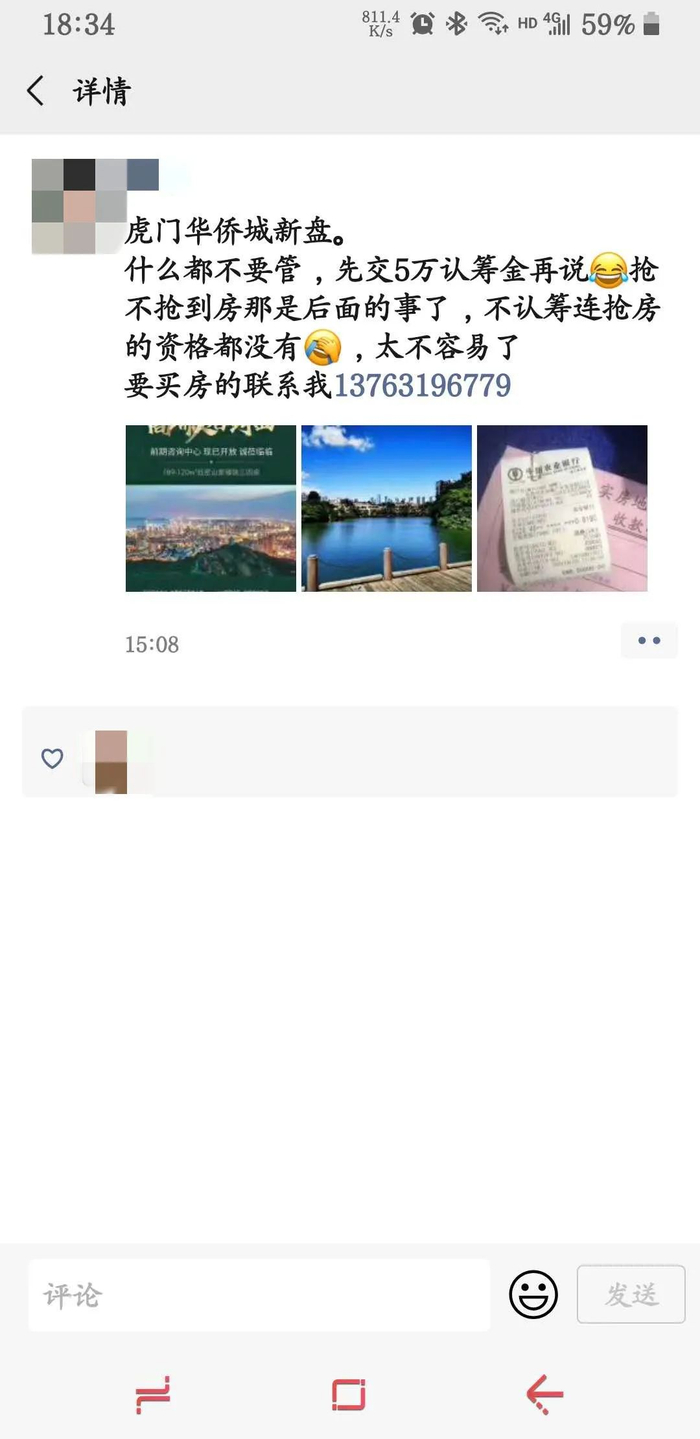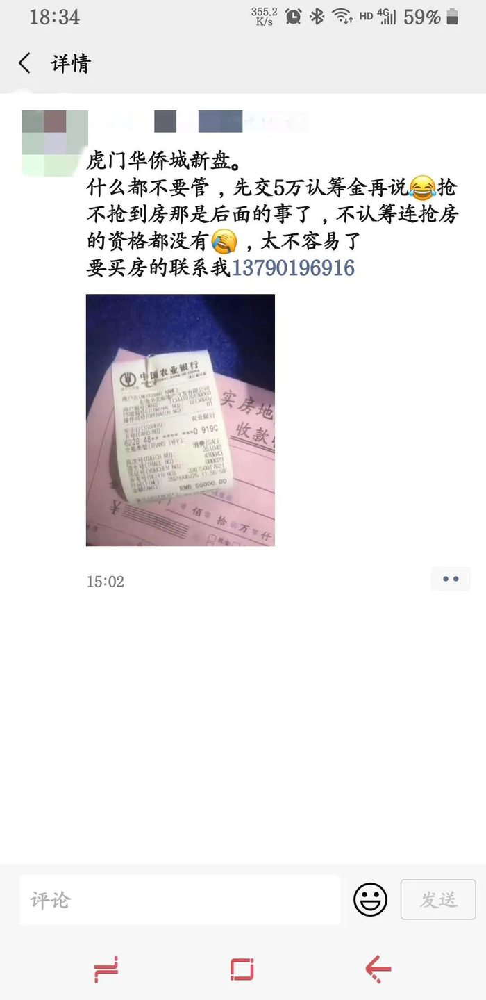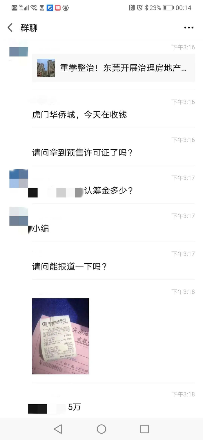 6月25日下午,家住虎门的郑先生(化名)突然看到有好几个中介都在朋友圈发布同一条消息:虎门华侨城新盘。什么都不要管,先交5万认筹金再说。抢不抢到房那是后面的事了,不认筹连抢房的资格都没有,太不容易了!