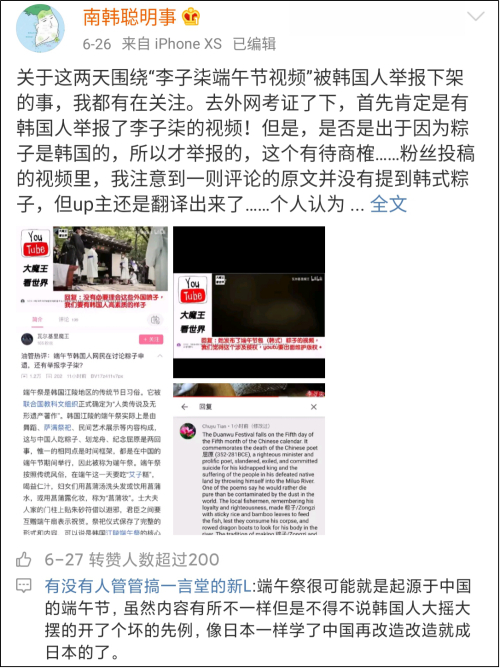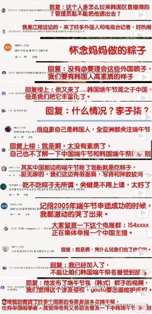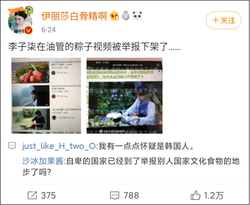 又例如,韩国人根本不吃粽子,也不会觉得这个是韩国食物,怎么会有“怀念妈妈做的粽子”与“(李子柒)发布了韩式粽子的视频”之类的说法?