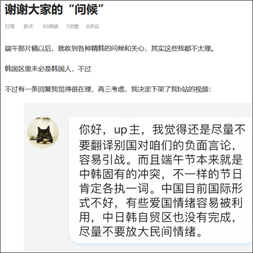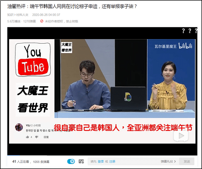 与此同时,也有B站up主@瓦尔基里魔王 上传了一段视频,内容为翻译韩国网民对端午申遗与举报李子柒粽子视频的讨论。