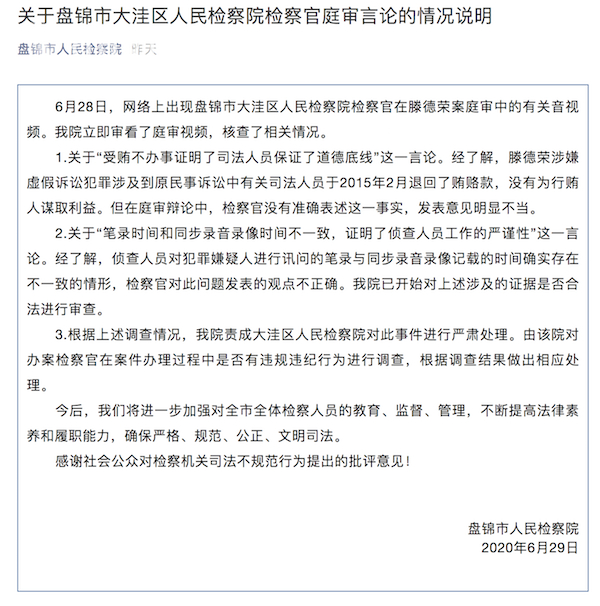 6月29日下午,盘锦市大洼区检察院公众号对此事通报称,关于“受贿不办事证明了司法人员保证了道德底线”这一言论,经核查,滕某涉嫌虚假诉讼犯罪涉及到原民事诉讼中有关司法人员于2015年2月退回了贿赂款,没有为行贿人谋取利益。但在庭审辩论中,检察官没有准确表述这一事实,发表意见明显不当。
