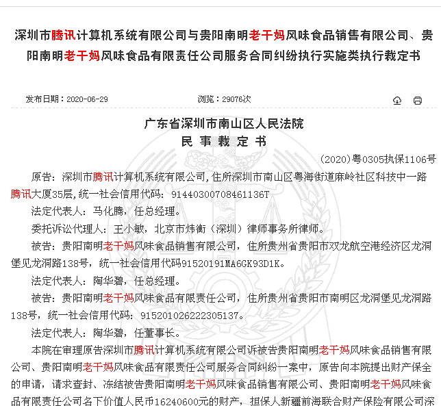 6月29日,在中国裁判文书网上,据广东省深圳市南山区人民法院的一封民事裁定书显示,原告深圳市腾讯计算机系统有限公司起诉被告贵阳南明老干妈风味食品销售有限公司、贵阳南明老干妈风味食品有限责任公司服务合同纠纷一案中,原告向法院提出财产保全的申请,请求查封、冻结被告贵阳南明老干妈风味食品销售有限公司、贵阳南明老干妈风味食品有限责任公司名下价值人民币16240600元的财产,担保人新疆前海联合财产保险有限公司深圳分公司和中国人民财产保险股份有限公司深圳分公司联合为本案财产保全提供信用担保。