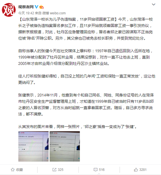 原标题:山东菏泽一校长为儿子伪造档案,11岁开始领国家工资
