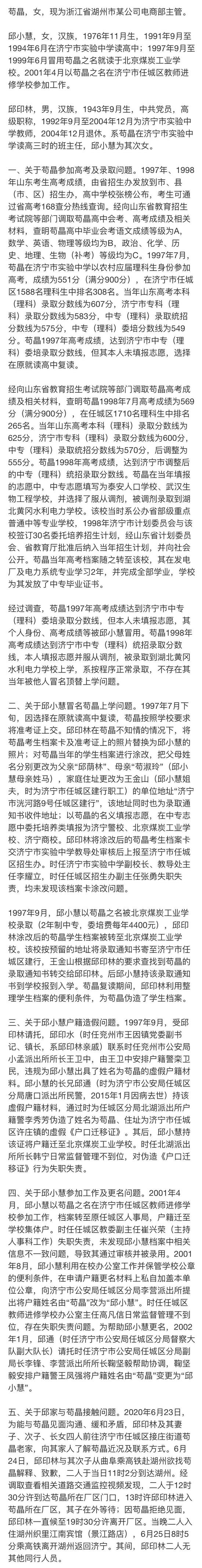 按调查组说法,1997年苟晶高考过了山东济宁市中专(理科)委培录取分数线,但最后没有填报志愿,选择了复读。班主任邱印林的女儿邱小慧利用苟晶放弃了的名额,以苟晶的名字去北京上了大学,也就是北京煤炭工业学校。