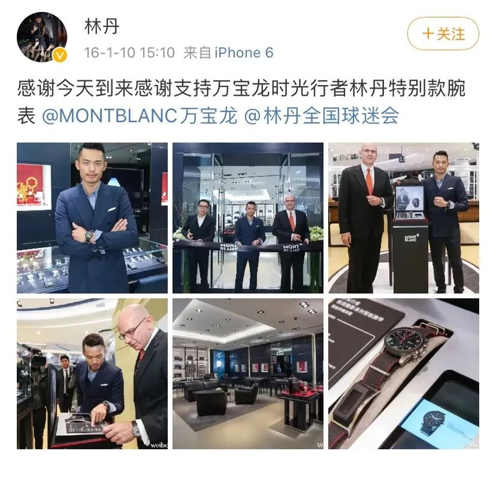 2014年,瑞士钟表集团历峰旗下的万宝龙宣布林丹成为中国区形象大使,此前万宝龙从来没有找过运动员做代言人,几乎都是好莱坞一线影星,但为了刺激中国市场的增长,选择了当时如日中天的林丹。