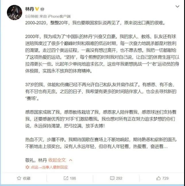 7月4日,两届奥运会羽毛球男单金牌获得者、五届世锦赛男单冠军,中国羽毛球名将林丹正式发微博宣布退役,结束国家队生涯。