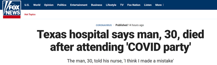 原标题:美国得州一30岁男子参加“新冠派对”后死亡,留下遗言:我想我做错了