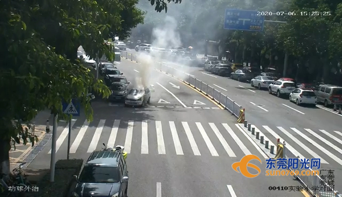 7月6日,一辆小车从金牛路往罗沙路行驶过程中,发现车头冒烟,便立即报警求助。当天下午大约3点17分,莞城铁骑大队接报后,安排铁骑第一时间赶往现场查看情况,并让司机立即下车待到安全地方。随后车辆发生自燃伴有明火,冒出大量浓烟,期间还发出异响,随时会有爆炸的危险。铁骑立刻将情况上报,通知消防车前来支援。