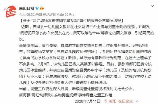 事情发生后,唐河县委、县政府立即成立调查处置工作组展开调查。7月11日,调查处置工作组在南阳日报官方微博上发布了关于 “网红幼师发布亲吻男童视频”事件的调查处置情况通报:经初步调查,涉事教师文某某(具有幼儿园教师资格证),系唐河县金拇指幼儿园唐城园(具有民办学校办学许可证)教师,其行为有悖教师行为规范,在社会上造成了不良影响。7月8日,该幼儿园已将文某某予以辞退。目前,县教育部门已责令该幼儿园停业整顿,并决定在暑期对全县民办中小学(幼儿园)及校外培训机构教师(从业人员)开展法律法规、教师行为规范及业务能力培训,对民办学校(幼儿园)及校外培训机构负责人进行管理能力提升培训。