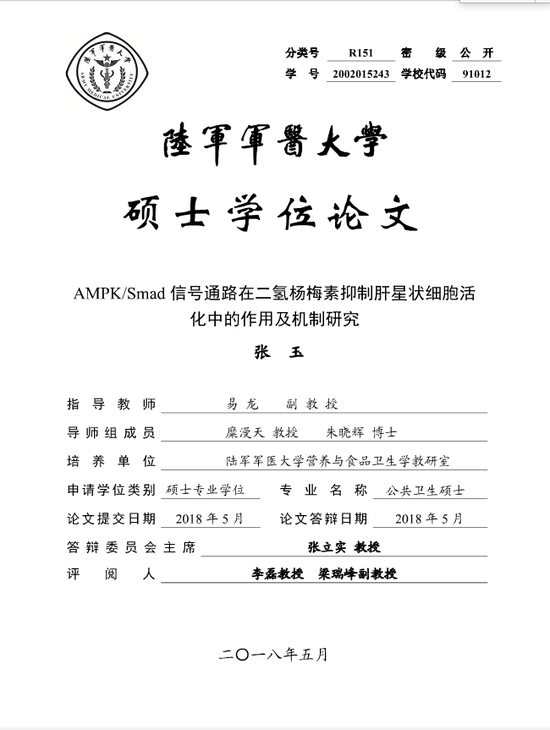 澎湃新闻发现,《第33届全国青少年科技创新大赛青少年科技创新成果竞赛项目获奖名单》显示,《二氢杨梅素调节肝脏脂代谢及细胞外基质生成的作用研究》项目的指导老师是易龙、李麒麟、张玉。而张玉的硕士学位论文显示,该论文的指导教师是易龙副教授,导师是糜漫天教授、朱晓辉博士,培养单位是陆军军医大学营养与食品卫生学教研室。
