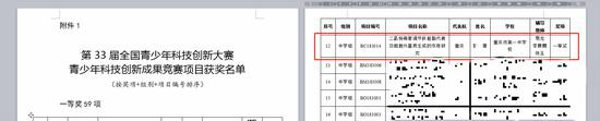 第33届全国青少年科技创新大赛青少年科技创新成果竞赛项目获奖名单中,该项目获一等奖。 来源:全国青少年科技创新大赛官网