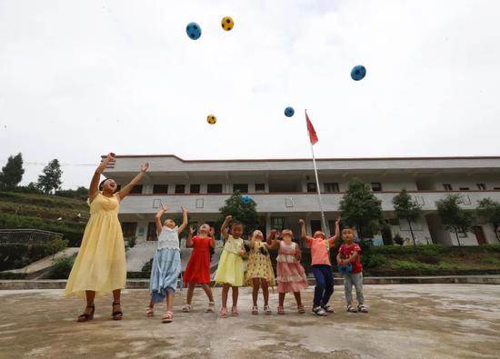 2019年6月19日,贵州玉屏,邹金香与学生在一起玩游戏。邹金香是贵州省铜仁市玉屏侗族自治县皂角坪街道铁家溪村铁家溪幼教点的一名教师,她一人“守着”学校的7名学生。22岁的她既是“校长”、“教务主任”,又是任课老师,还是学校负责学生营养餐和后勤保障的负责人。