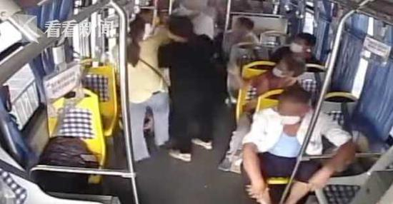 见状,坐在离司机不远处的李伟伟,一个箭步上前抱住了男子。此时,男子的妻子也上前来劝阻男子,男子回到了座位上。
