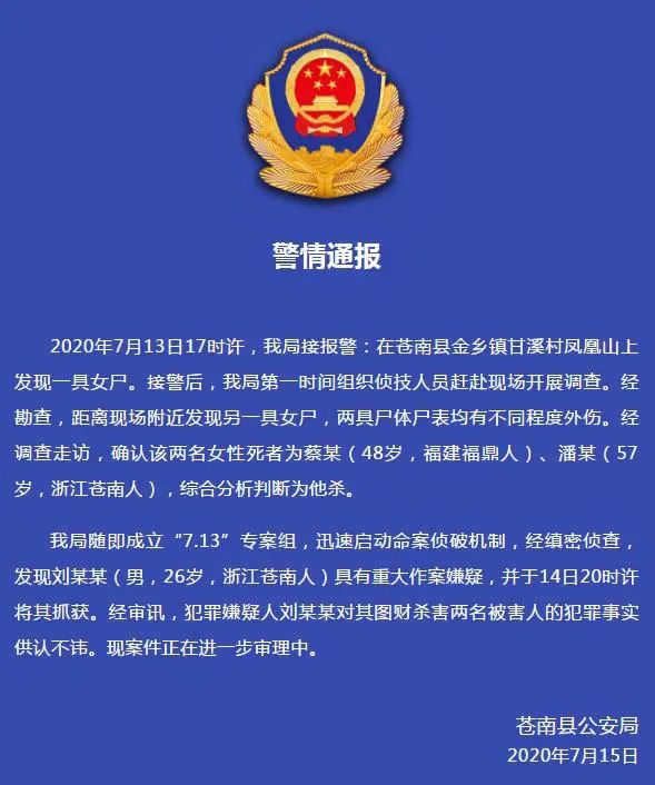 今天上午,温州市苍南县公安局发布警情通报,7月13日17时许,警方在苍南县金乡镇甘溪村凤凰山上先后发现两具女尸。14日20时许,苍南警方抓获犯罪嫌疑人刘某某,刘某某对其图财杀害两名被害人的犯罪事实供认不讳。