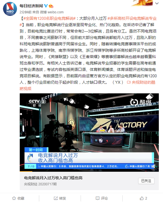 原标题:全国有1200名职业电竞解说:大部分月入过万 多所高校开设电竞解说专业