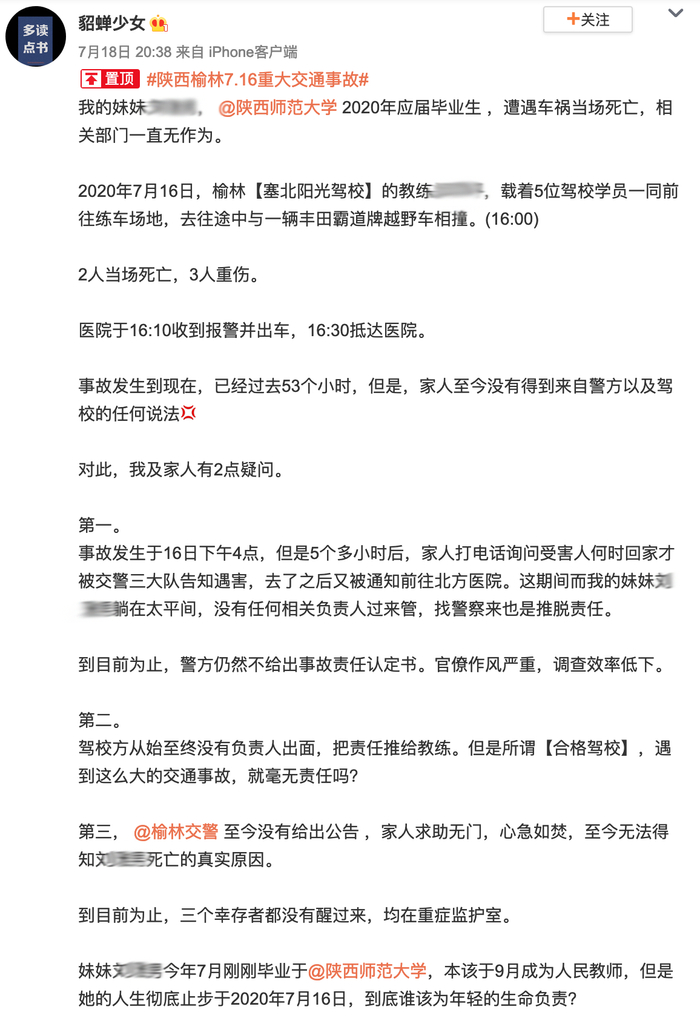 7月18日,微博用户“貂蝉少女”(刘某某家属)发布微博就“7.16”陕西师范大学应届毕业生遭遇车祸当场死亡一事质疑办案部门延迟通知家属和至今未认定责任。文章中称,在事发后5小时,交警部门才通知死者家属。驾校方面至今无人出面给出说法,交警部门也不开具事故责任认定书。