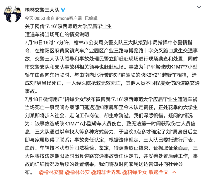 7月18日微博用户“貂蝉少女”发布微博就“7.16”陕西师范大学应届毕业生遭遇车祸当场死亡一事疑问办案部门延迟通知家属和至今未认定责任。正处花季的大学生刘某即将步入社会、走向工作岗位,却生命消逝,我们深感惋惜。疑问的情况为:该事故造成陕K1M7*7小型轿车人员伤亡,致无法第一时间获取伤亡人员信息,三大队通过以车找人等多种方式努力,于当晚9点多才确定了刘*男身份后立即与家属取得了联系;事故责任认定,根据法律规定,三大队已委托进行尸表、血醇、车辆技术状态等司法检验、鉴定,待调查取证结束、证据取证全面后,三大队将按法定期限及时出具道路交通事故责任认定书,并妥善处置后续工作,事故的详细情况及后续的处置结果,我们将及时向家属送达告知并向社会公布。