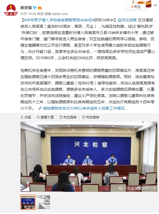 @河北检察 近日通报,被告人房某某(案发时49周岁,离异,无业),为满足性刺激,经过“事先踩点”“乔装打扮”,故意选择在凌晨时分潜入我省某市三县10余所乡镇中小学,通过破坏宿舍门窗、溜门等手段进入男生宿舍,对正在熟睡的男同学以搂抱、亲吻、抚摸生殖器等方式公开进行猥亵,甚至对多个学生使用暴力威胁手段实施猥亵行为,共计作案11起,受害学生多达40余名,一度给周边多所学校师生造成严重心理恐慌。2018年8月,公安机关经DNA比对,抓获房某某。