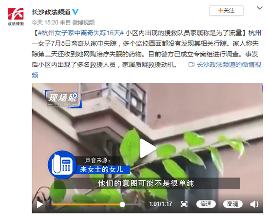 原标题:#杭州女子家中离奇失踪16天# 小区内出现的搜救队员家属称是为了流量