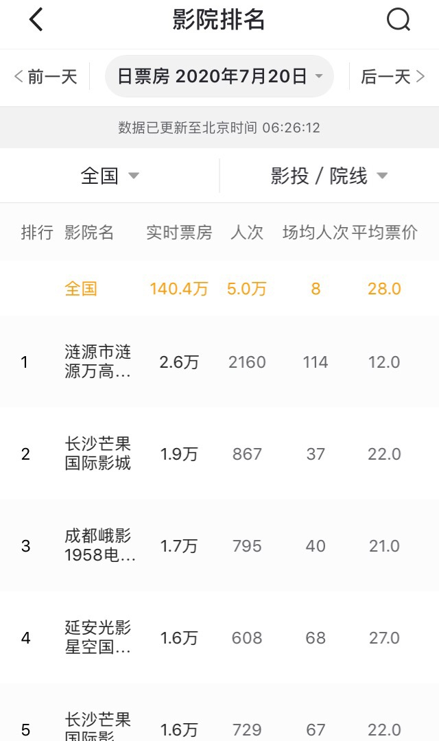 平台数据显示,7月20日票房最高的5家影院分别是湖南涟源万高激光巨幕影城、长沙芒果国际影城、成都峨影1958影城、陕西延安光影星空国际影城(东大上品店)以及长沙芒果国际影城(奥克斯缤纷广场店)。其中3家影城均位于湖南省。