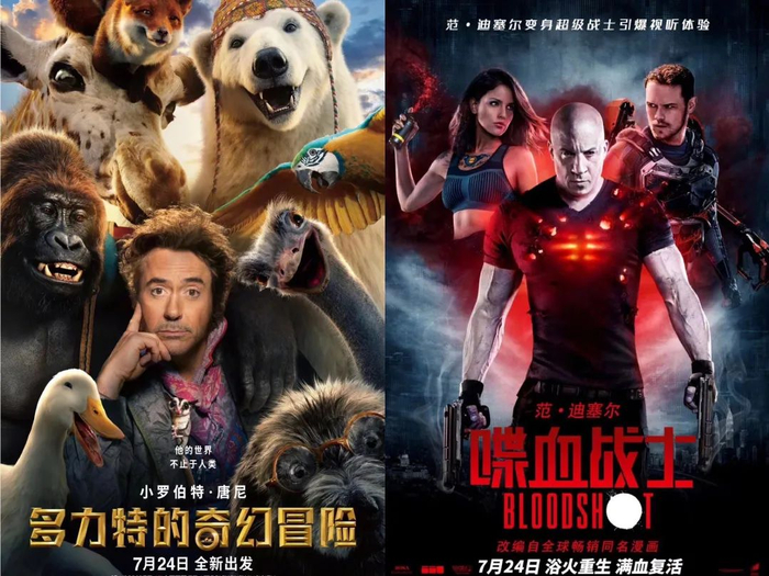 一部是“钢铁侠”小罗伯特·唐尼主演的《多利特的奇幻冒险》,一部是“速度与激情”系列主演范·迪塞尔的《喋血战士》。
