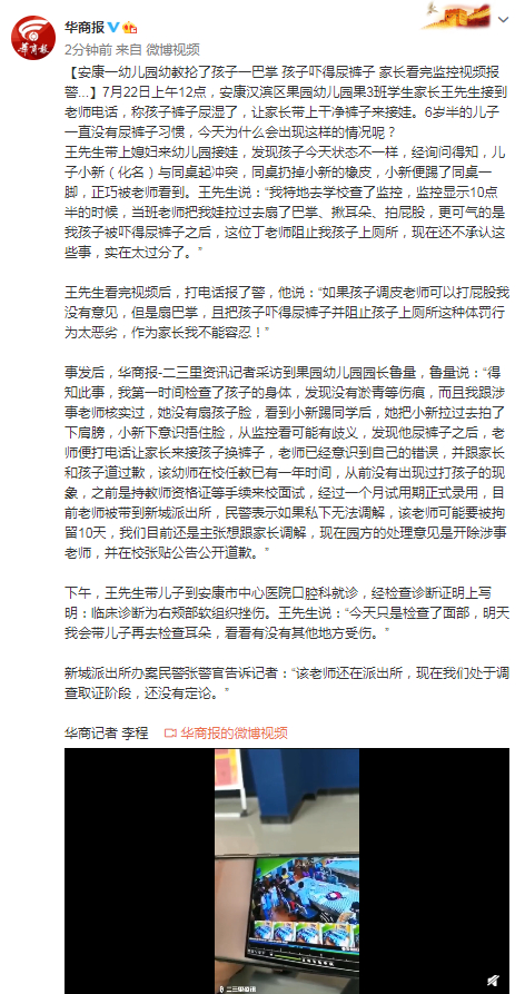 王先生看完视频后,打电话报了警,他说:“如果孩子调皮老师可以打屁股我没有意见,但是扇巴掌,且把孩子吓得尿裤子并阻止孩子上厕所这种体罚行为太恶劣,作为家长我不能容忍!”