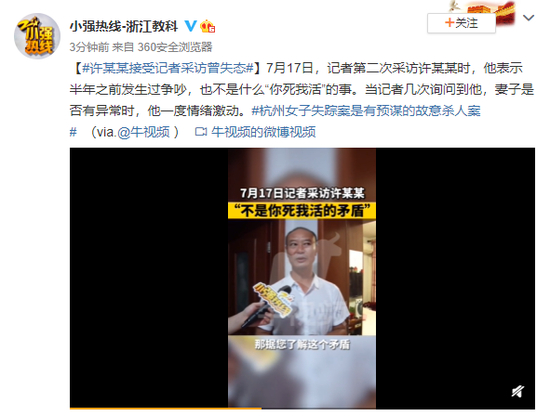 7月17日,记者第二次采访许某某时,他表示半年之前发生过争吵,也不是什么“你死我活”的事。当记者几次询问到他,妻子是否有异常时,他一度情绪激动。