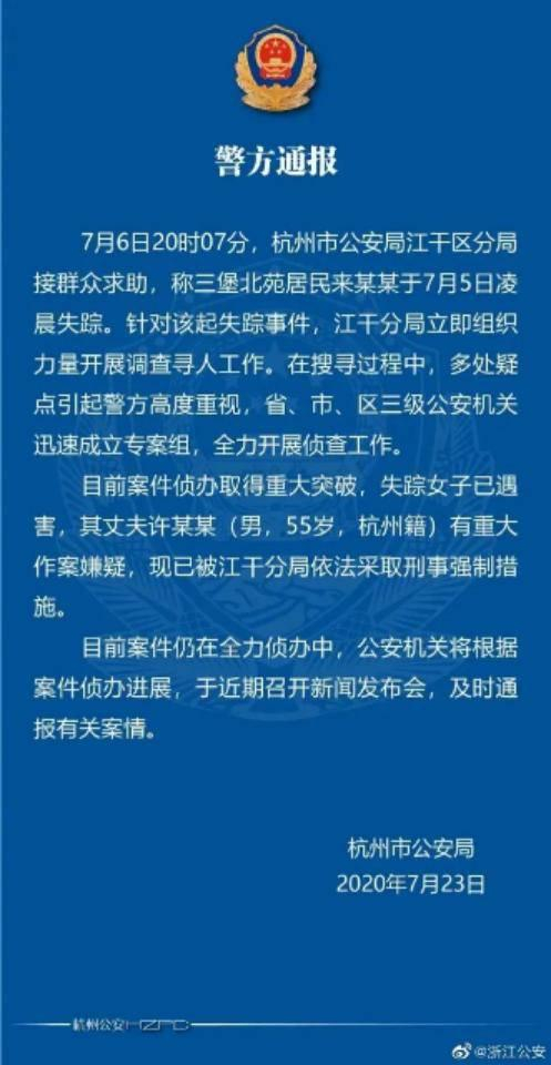 7月23日晚,在来女士失踪的第19天,杭州警方通报称该名女子已遇害,其丈夫有重大作案嫌疑,已被控制。