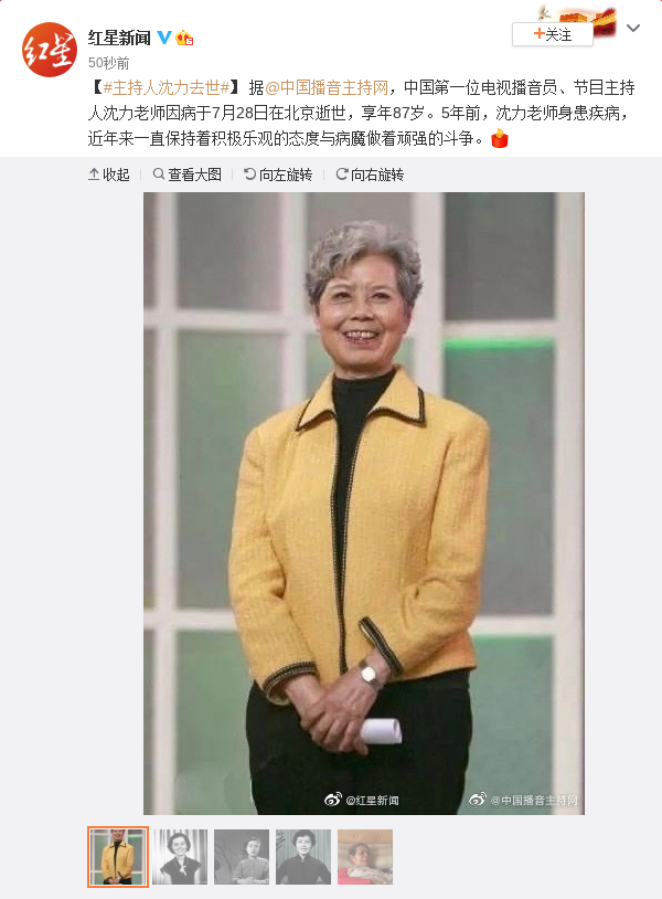 据@中国播音主持网,中国第一位电视播音员、节目主持人沈力老师因病于7月28日在北京逝世,享年87岁。5年前,沈力老师身患疾病,近年来一直保持着积极乐观的态度与病魔做着顽强的斗争。