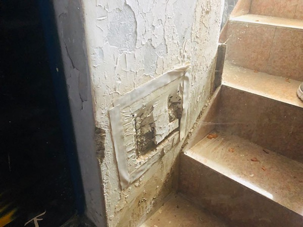 “必胜马”鞋店内留油警方取证的痕迹,多处墙皮被取下。