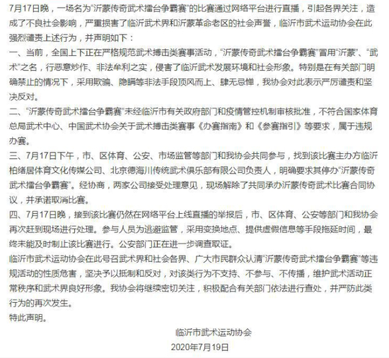 7月19日,临沂市武术运动协会发文回应称,此次“沂蒙传奇武术擂台争霸赛”系违规办赛,表演造成了不良的社会影响,该协会对此强烈谴责和坚决反对,目前,由体育、公安、市场监管等部门和临沂市武协已经组成工作小组,对此次赛事活动进行调查。