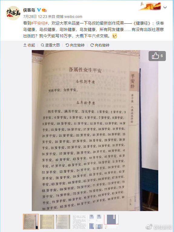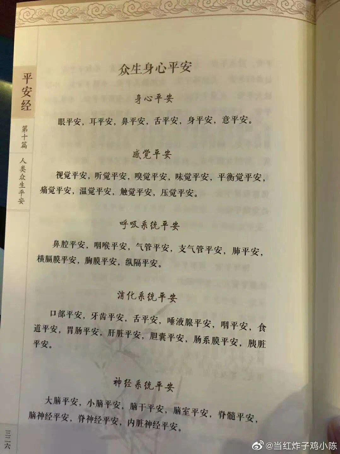 “创意”十足、剑走“偏锋”的《平安经》瞬间爆红,火出圈外。我所在的几个微信群,都掀起了用“平安”造句的高潮——一个让人尊敬的师长,在群里@了每一个人,向每个人道“平安”。很明显,这是一种“行为艺术”。人们玩这个,是在表达一种抗议。很多真正有价值的著作都很难出版,这种毫无意义的“句子复制、粘贴”,却堂而皇之出版、发行、销售,不能不让人深思。