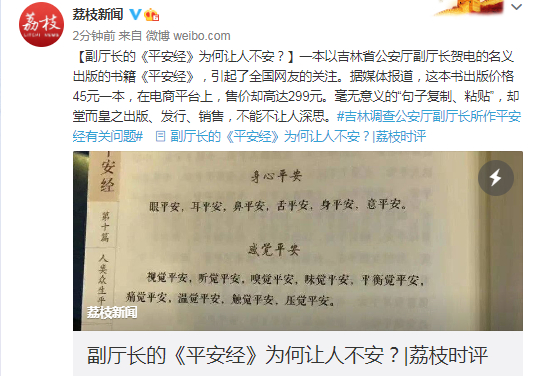 吉林省公安厅副厅长贺电,如今正处在麻烦之中。一本以他名义出版的书籍《平安经》,引起了全国网友的关注。据媒体报道,这本书出版价格45元一本,但是在电商平台上,售价却高达299元。